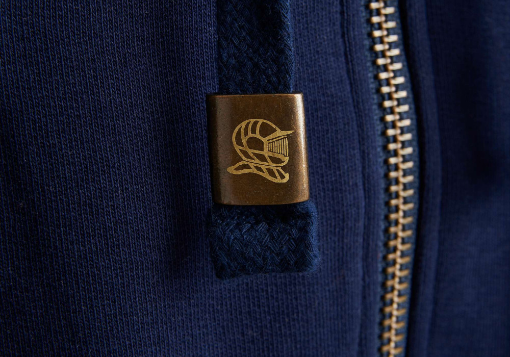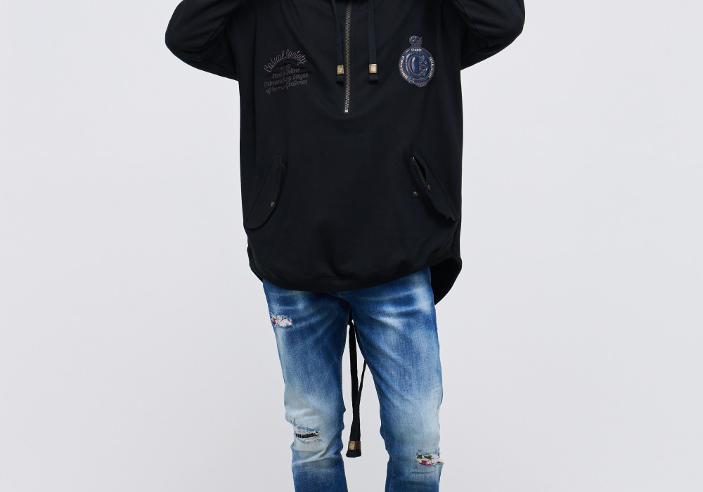 Keeping true to the spirit of the brand, the rear of the garment is adorned with embossed fonts and a Templars Helmet cut from a refined embossed micro-leather applique. The front chest displays a micro-leather twist on the Royal Order of the Garter logo, and Extraordinary League cursive font artwork.